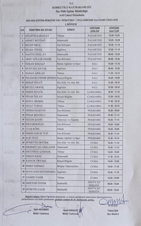 Eğitim-Öğretimin aksamaması ve sizlerin geldiğinizde beklemeden öğretmenlerimizle görüşebilmesi için lütfen görüşmelere; görüşme saatinin ilk 20. dakikasında geliniz. Okul Yönetimi